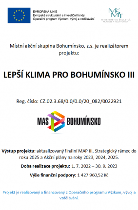 Projekt Lepší KLIMA pro Bohumínsko III navazuje na vytvořený Místní akční plán vzdělávání v ORP Bohumín zaměřený na rozvoj kvalitního a inkluzivního vzdělávání dětí a žáků do 15 let. Hlavní cílem projektu je rozvoj a aktualizace MAP a evaluace procesu místního akčního plánování. Dále prohlubuje již fungující partnerství formou společného plánování, sdílení aktivit, plánováním partnerských aktivit a vyhodnocováním přínosů spolupráce. Realizace projektu v území ORP Bohumín (Bohumín, Dolní Lutyně, Rychvald).