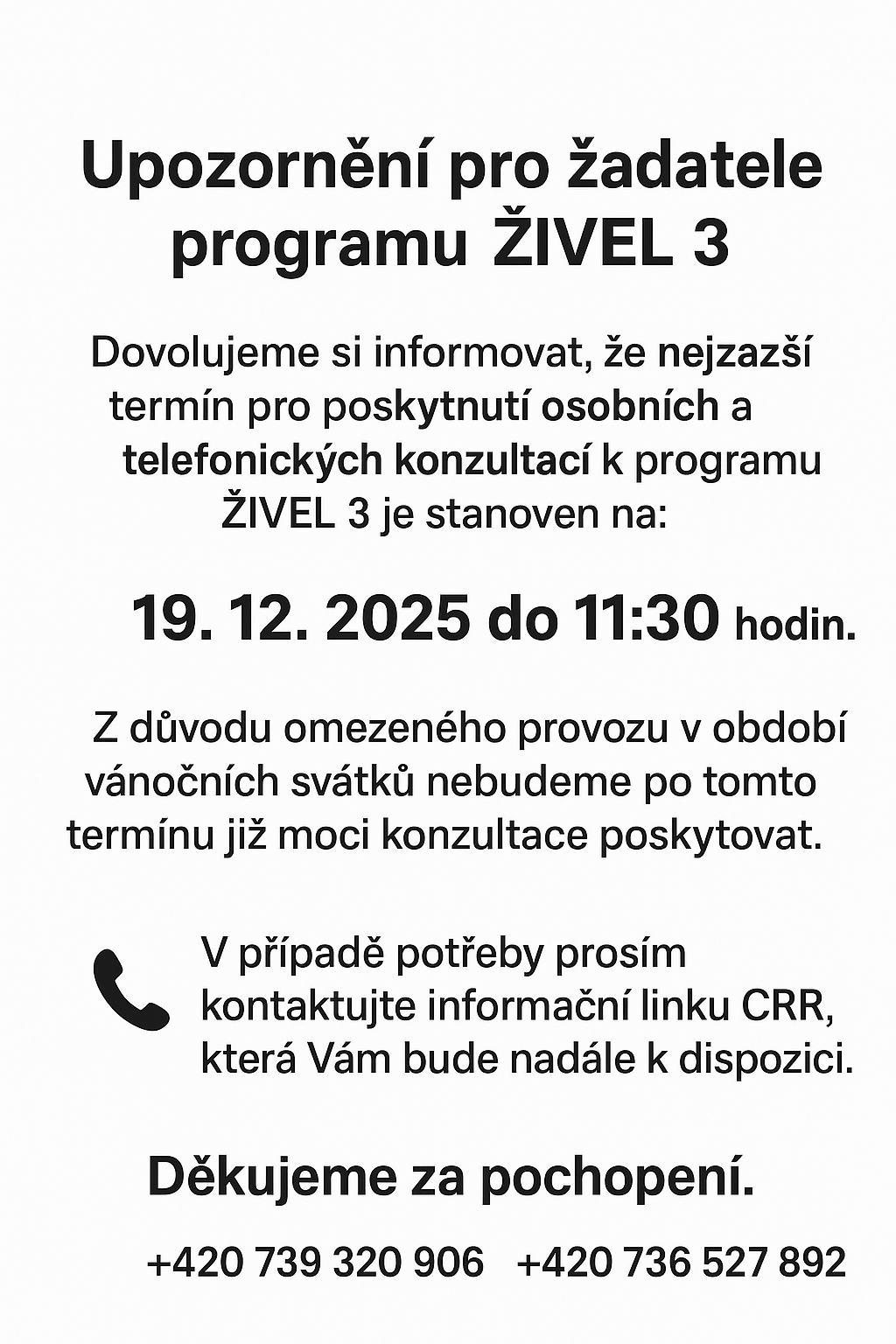 UPOZORNĚNÍ PRO ŽADATELE PROGRAMU ŽIVEL 3